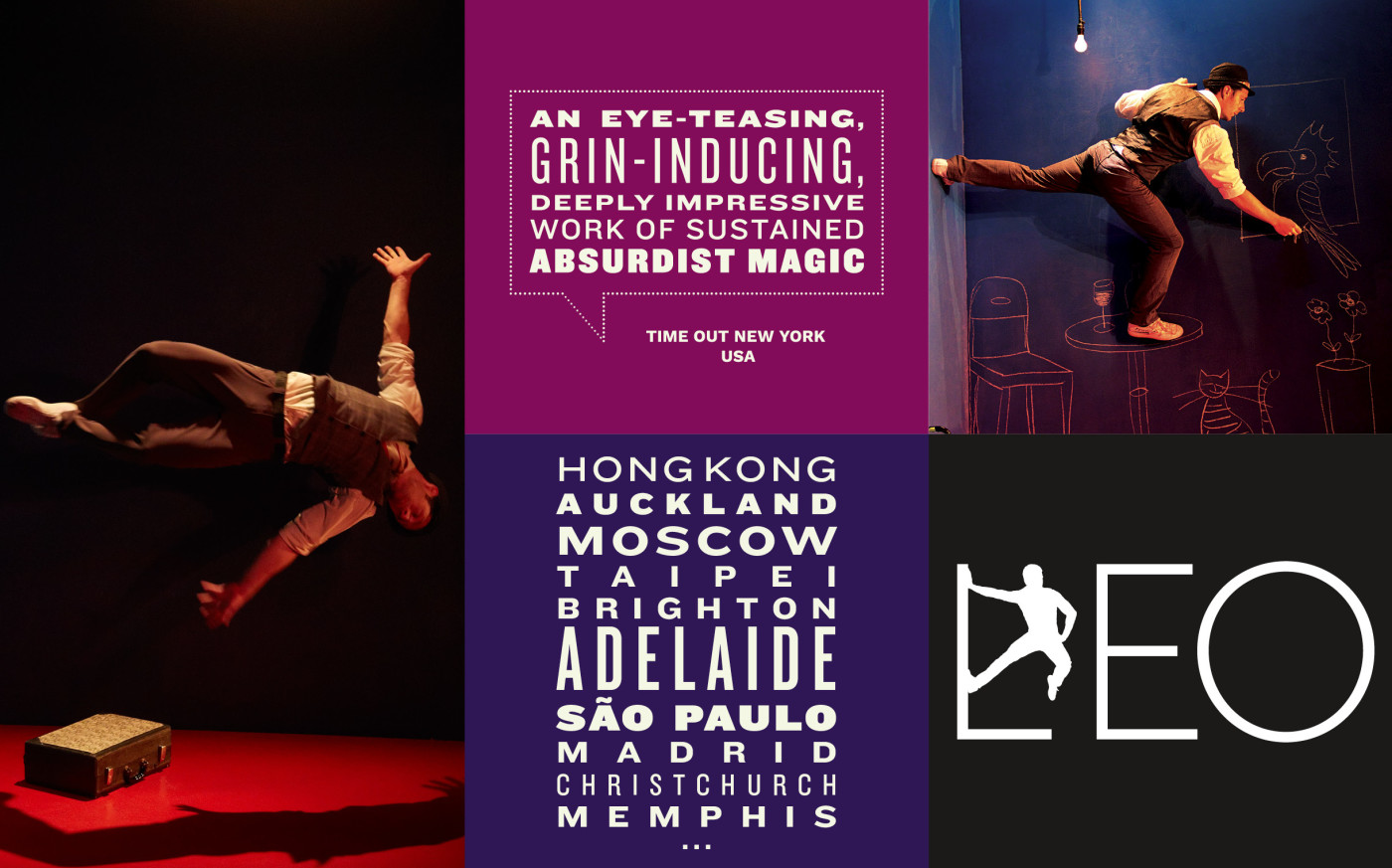 LEO is a mind-bending, funny, surreal, and surprisingly touching work that challenges the senses and tests perceptions of reality through the clever interplay of live performance and video projection. LEO leaves audience members wondering which way is up and which way is down.